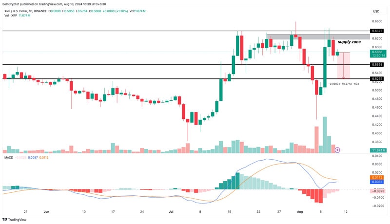 با این حال، اگر فشار خرید بالا رفتن یابد، نرخ ریپل امکان دارد جهش دیگری را تجربه کرده و به ۰.۶۳ دلار برسد.