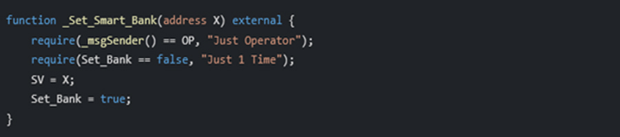 یکی دیگر از بخشهای نگرانکننده این پروژه، تابع _Set_Smart_Bank است که به اپراتور اجازه میدهد آدرس کیف پول اصلی Smart Bank (یا SV) را تغییر دهد: