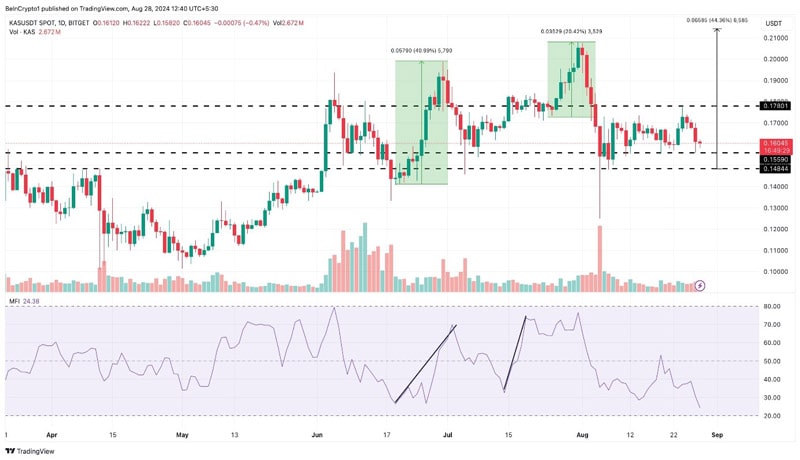 شاخص جریان پول (MFI) کاسپا نشان میدهد که این رمز ارز در وضعیت اشباع فروش قرار دارد که میتواند نشانهای از بالا رفتن احتمالی نرخ باشد. بر همین اساس، کارشناسان پیشبینی میکنند که نرخ KAS امکان دارد در ماه سپتامبر به ۰.۲۱ دلار یا بالاتر برسد. البته این پیشبینی در صورت رکود بازار امکان دارد تغییر کند و نرخ تا ۰.۱۴ دلار نزول یابد.