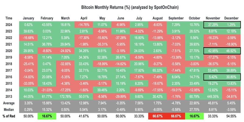 نرخ بیتکوین (BTC) در ماه نوامبر پس از پیروزی دونالد ترامپ، رشدی ۳۷.۳ درصدی را تجربه کرد. دادههای تاریخی نشان میدهند که این روند صعودی امکان دارد در ماه دسامبر به ۳۰ تا ۴۶ درصد بالا رفتن یابد.