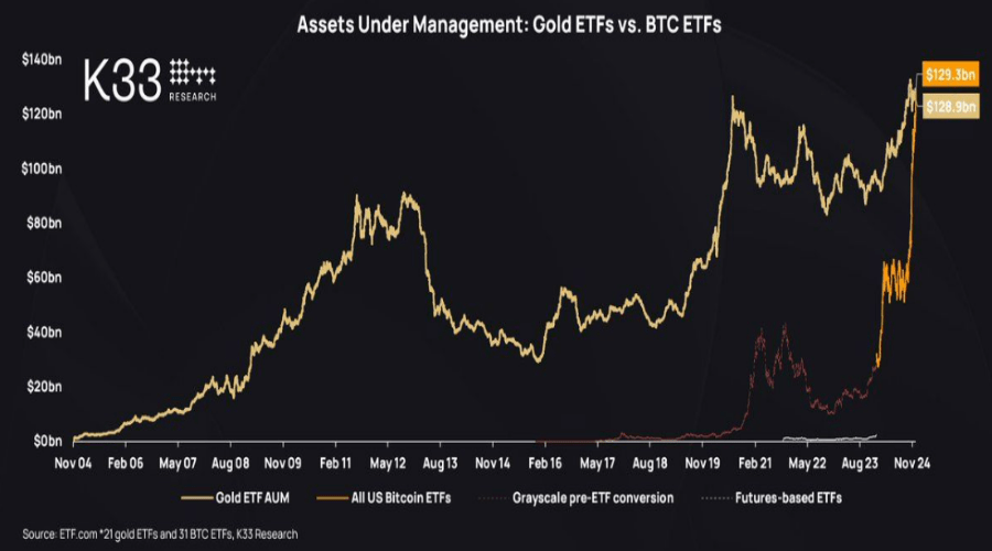 به گفته وتله لوند، بررسی‌کننده کمپانی تحقیقاتی کی۳۳ ریسرچ (K33 Research)، نرخ دارایی‌های تحت مدیریت (AUM) صندوق‌های ETF اسپات بیت‌کوین در ایالات متحده از صندوق‌های ETF طلا پیشی گرفته است.