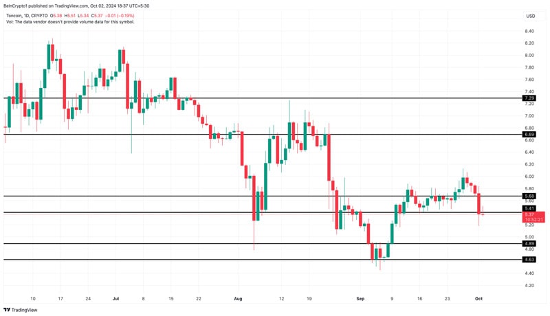در ۲۸ سپتامبر، نرخ تون‌کوین (TON) برای اولین بار در بیش از یک ماه گذشته به ۶ دلار رسید. ولی این آلت‌کوین نتوانست در این لایه باقی بماند و به ۵.۴۰ دلار نزول یافت.