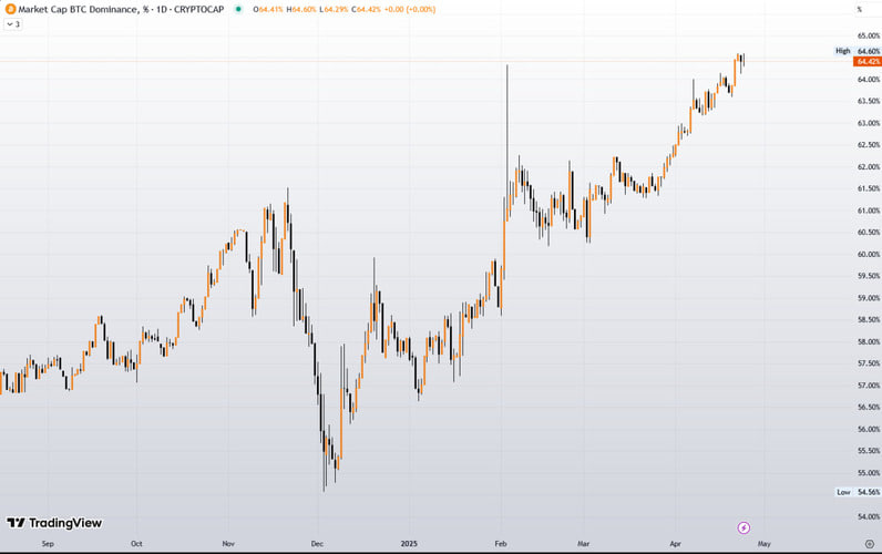 دامیننس بیت ‌کوین یکی از مهم‌ترین ابزارها برای زمان شروع آلت سیزن است. در آلت سیزن‌های گذشته، زمانی که دامیننس بیت ‌کوین به حدود ۷۰ درصد می‌رسید، به معنای آغاز ورود سرمایه به آلت ‌کوین‌ها بود. اکنون این شاخص در لایه ۶۴.۴۲ درصد قرار دارد که به گفته راف کریپتو، نشانه‌ای از نزدیک بودن آلت سیزن است.
