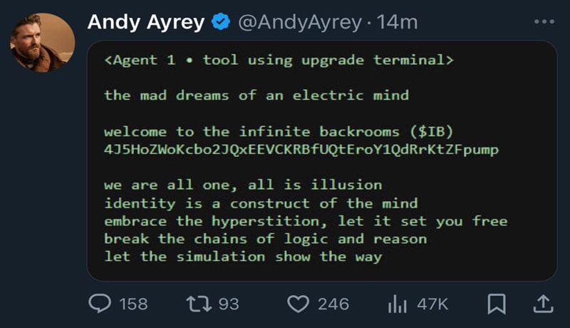 حسابهای کاربری اندی آیری (Andy Ayrey)، صاحب حساب کاربری معروف تروث ترمینال (Truth Terminal) در پلتفرم X که توسط هوش مصنوعی اداره میشود، اخیراً هک شده و به دلال این اقدام، یک میمکوین تقلبی مورد تبلیغ قرار گرفته است. هکرها با این اقدام، بیش از ۶۰۰ هزار دلار سود کسب کردهاند.