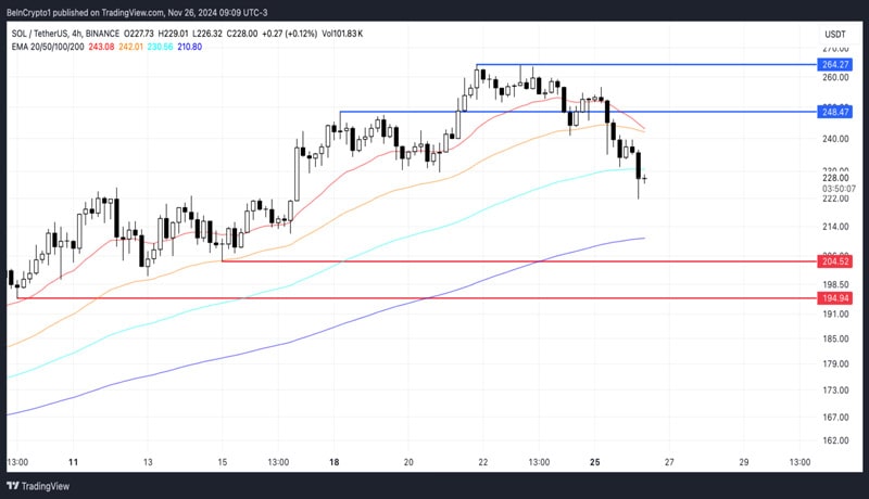 نرخ سولانا (SOL) در ۲۲ نوامبر به بالاترین سقف تاریخی خود یعنی ۲۶۴ دلار رسید، ولی از آن زمان وارد یک روند اصلاحی شده و در ۲۴ ساعت گذشته حدود ۱۰ درصد نزول یافته است.