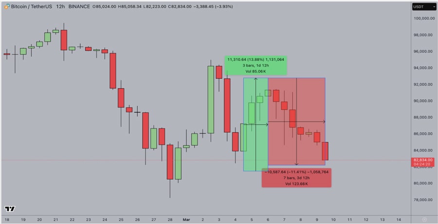 روز یکشنبه ۹ مارس، نرخ بیت‌کوین به ۸۲,۲۲۰ دلار نزول یافت که بیانگر افت ۱۵ درصدی نسبت به اوج ۹۵,۰۰۰ دلاری هفته گذشته است. این نزول عمدتاً به دلیل دلواپسی‌های ناشی از تورم و بالا رفتن نرخ بیکاری در آمریکا بود. داده‌های اشتغال بخش غیرکشاورزی (NFP) آمریکا که روز جمعه منتشر شد، وضعیت اقتصادی نامطمئنی را نشان داد و به احساسات منفی بازار افزود.