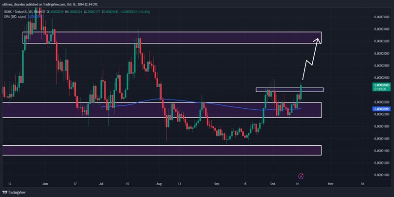 تحلیل نمودار روزانه BONK نشان میدهد که این میمکوین در وضعیت صعودی قرار دارد و احتمالاً در روزهای آینده توسعه قابلتوجهی را تجربه خواهد کرد.