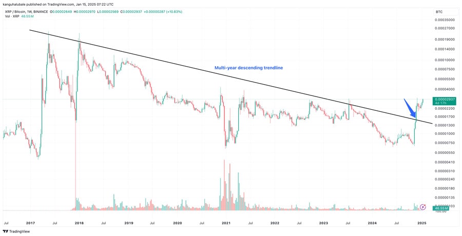 در کنار این، در نمودار XRP/BTC یک مقاومت نزولی ۸ ساله شکسته شده که بیانگر ارتقا موقعیت این آلتکوین در برابر بیتکوین است. تعداد دارندگان ریپل نیز در سال ۲۰۲۵ با افزایشی ۵۸۰۰۰ نفری همراه بوده که این امر بیانگر تعهد قوی جامعه به نگهداری این رمز ارز است.