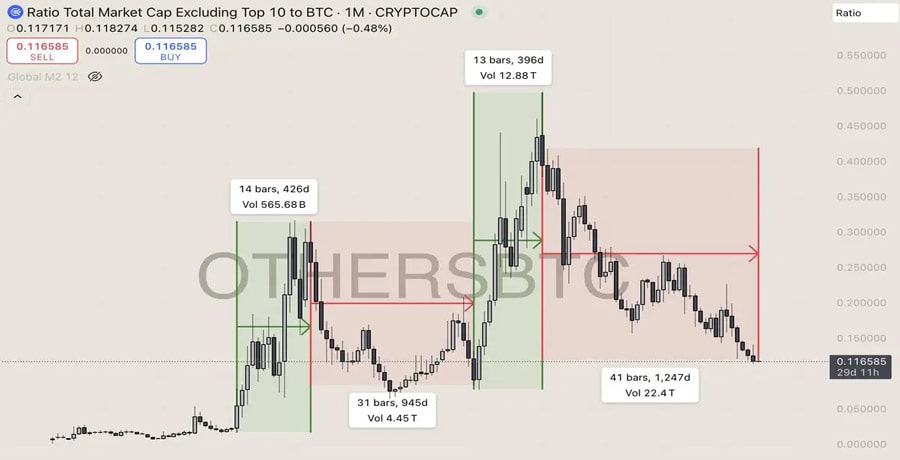 این روند نزولی که از اوایل سال ۲۰۲۱ شروع شده، طولانیتر از دو اصلاح بزرگ قبلی آلتکوینها است.