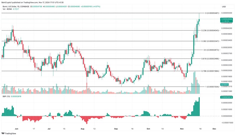 از سوی دیگر، شاخص قدرت خریداران و فروشندگان (BBP) بالا رفته که بیانگر ارتقا خریداران و احتمال توسعه نرخ تا محدوده ۰.۰۰۰۰۵۵ دلار می باشد. با این حال، اگر بازار به وضعیت اشباع خرید برسد، نرخ بانک امکان دارد تا محدوده ۰.۰۰۰۰۳۰ دلار نزول یابد.bonk-market-cap-flips-wif