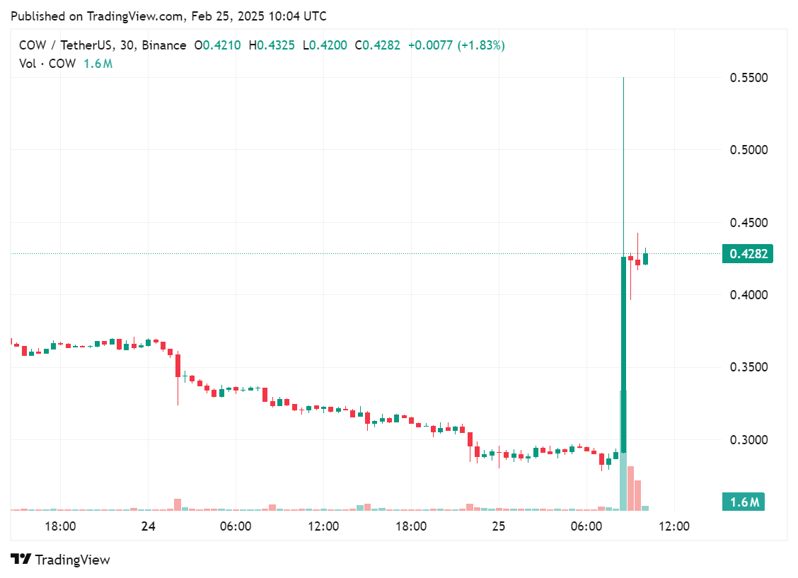 مدتی پس از اعلام فهرست شدن COW توسط Upbit، این توکن شاهد افزایش قیمت قابل توجهی بود. COW بلافاصله پس از انتشار اطلاعیه، تا ۴۶٪ افزایش یافت و به قله قیمت ۰.۴۶ دلار در معاملات روزانه رسید. در زمان نگارش این مطلب، COW با قیمت ۰.۴۳ دلار معامله میشود.