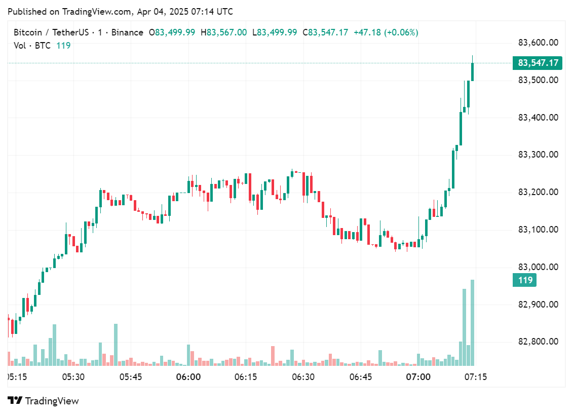 بلافاصله پس از اعلام، بیت کوین (BTC) نزدیک به ۴٪ کاهش یافت. ارزش آن که به سختی بالای ۸۰,۰۰۰ دلار باقی مانده بود، کمی به ۰.۰۳٪ به ۸۳,۲۱۰ دلار بازگشت.