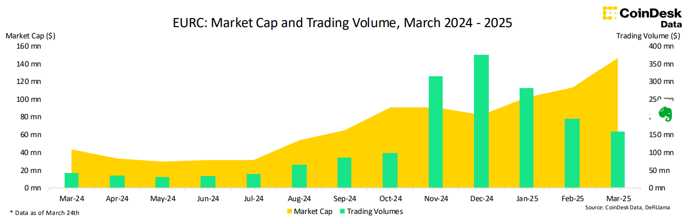 از طرف دیگر، EURC (EURC)، استیبلکوینی که توسط Circle پشتیبانی شده و به یورو مرتبط است، شاهد افزایش ارزش بازار ۲۹.۵٪ به ۱۴۷ میلیون دلار بود و یک رکورد تاریخی جدید را ثبت کرد و سومین ماه متوالی رشد را رقم زد. این افزایش عمدتاً به دلیل حذف استیبلکوینهای غیر MiCA مانند USDT در صرافیهای اروپایی بوده است که کاربران و پلتفرمها را وادار به انتقال به جایگزینهای دارای مجوزی مانند EURC کرده است. به همین دلیل، اکنون EURC ۴۵.۶٪ از ارزش کل بازار استیبلکوینهای مبتنی بر یورو را تشکیل میدهد.