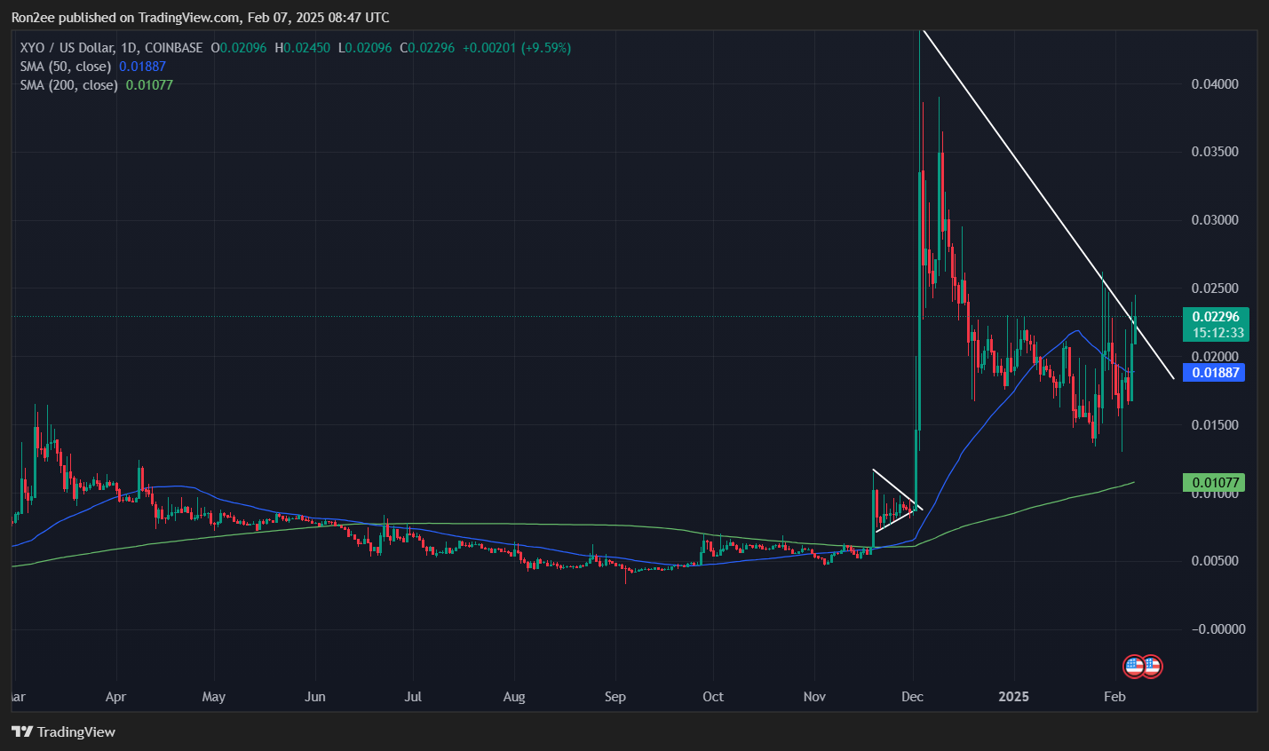 در نمودار قیمت 1 روزه/USDT، XYO بالاتر از خط روند نزولی شکسته است که از ارتباط دادن بالاترینهای روزانه حرکات آلتکوینها به وجود آمده است، که نشاندهنده یک معکوس قوی صعودی از روند نزولی اخیر است.