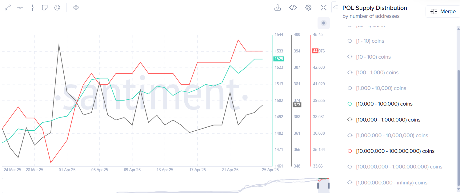 افزایش احساس مثبت بین سرمایهگذاران همچنین در افزایش مداوم تعداد کیف پولهایی که بین ۱۰,۰۰۰ تا ۱۰۰ میلیون توکن POL دارند، مشهود است. این نشان میدهد که نهنگها و دارندگان متوسط در حال انباشت هستند، احتمالاً انتظار افزایش بیشتر را دارند.