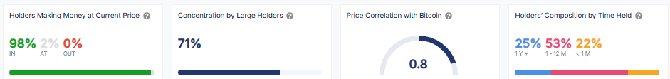 طبق دادههای IntoTheBlock، ۹۸٪ از دارندگان پیپ الآن در حال کسب درآمد در قیمت کنونی هستند و ۰٪ از دارندگان در ضرر هستند.