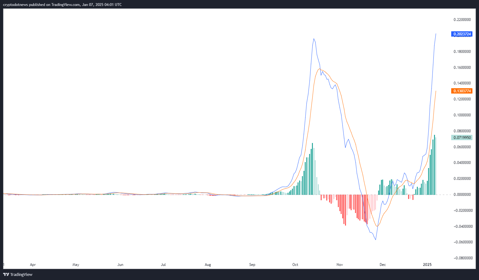 هیستوگرام MACD که نوارهای سبز افزاینده را نشان میدهد، به فشار خرید مداوم اشاره دارد. علاوه بر این، افزایش حجم تجاری نشانهای از ادامه ذوق و شوق در بازار است.