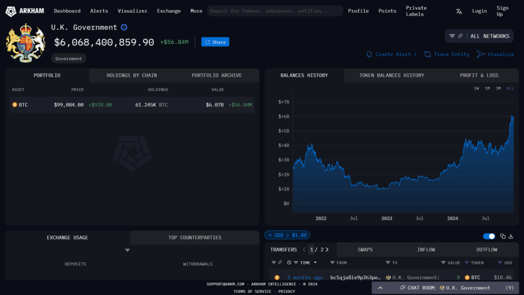 آرکهم اینتلیجنس، بر اساس دادههای تحلیل زنجیرهای در تاریخ ۶ دسامبر، کیف پولی را پیدا کرده است که به دولت بریتانیا متصل است و ۶۱.۲۴۵ هزار بیت کوین (BTC) به ارزش ۶ میلیارد دلار را در اختیار دارد. این کیف پول همچنین از حرکت قیمت بیت کوین سود کسب کرده و بیش از ۲۸ میلیون دلار سود غیر واقعی دارد.