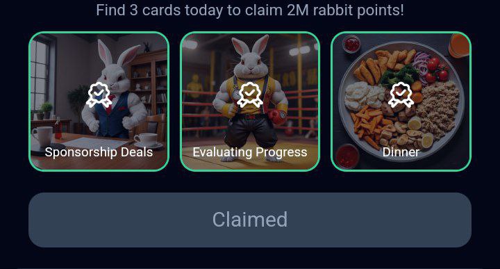 کارتهای راکی رابیت یا همان کمبو روزانه راکی ربیت کارتهایی هستند که بهصورت روزانه از بخش Mine در بازی راکی ربیت انتخاب میشوند. پیداکردن و واردکردن این سه کارت ۲,۰۰۰,۰۰۰ سکه پاداش دارد.
